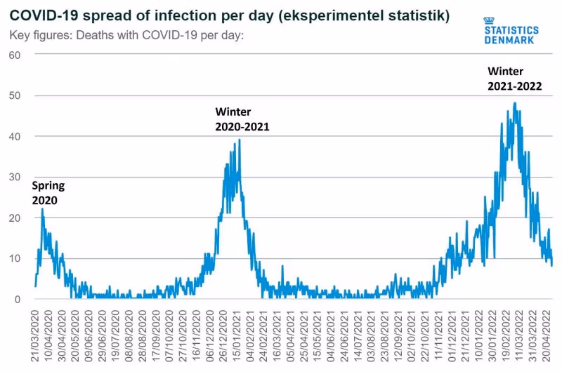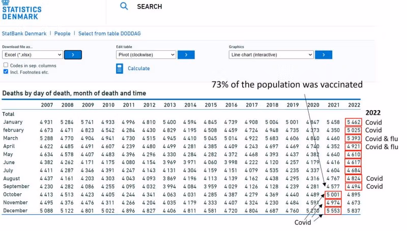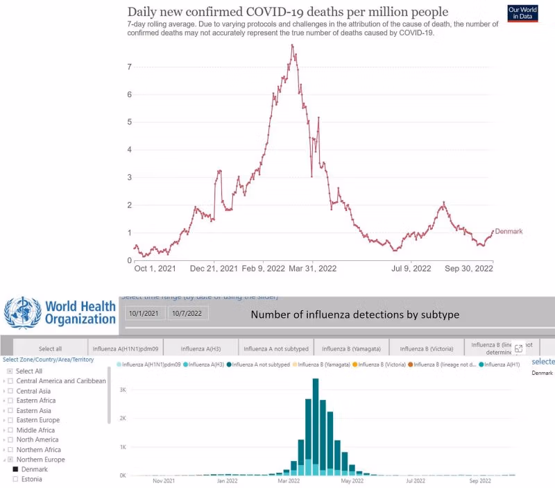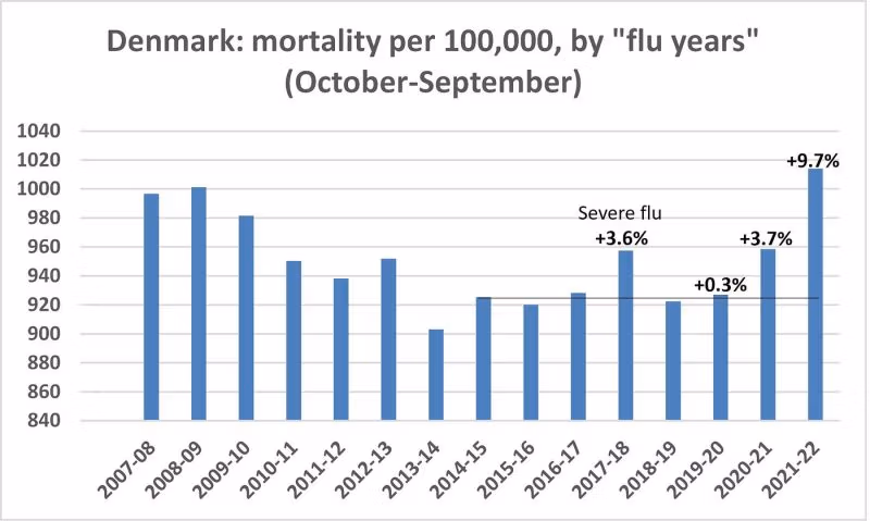 Vlna chřipky v Dánsku byla krátká a může způsobit úmrtí pouze za dva až tři měsíce. Nemůže za to velkou část 10procentní nadúmrtnosti v minulém chřipkovém roce. Některá nadměrná úmrtí mohla být způsobena vakcínami Covid a jinými příčinami, jako jsou pozdní následky narušeného života. Nicméně většina nadměrné úmrtnosti v Dánsku musela být úmrtí na covid, spojená s velkou, prodlouženou vlnou Covid (6–7 měsíců) a další malou vlnou (2 měsíce).