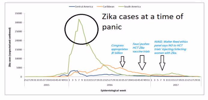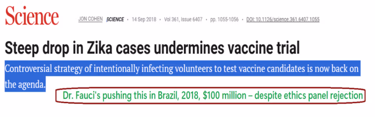 Pod jejich dohledem NIAID záměrně ignoroval etický panel z roku 2017, který rozhodl proti pokusům s lidským virem Zika, prosazovat experimenty, které Brazílie odmítla a které nyní probíhají v Baltimoru. Další skandál spočívá v tom, jak se narychlo předpokládané spojení Zika-mikrocefalie stalo v první řadě globální krizí: strachem poháněná panika, rozdmýchaná Brazilská média/levice (využívající hrozbu mikrocefalie Zika jako páku na převratné omezení potratů v Brazílii) — a kde zejména Fauci vyhrožoval a zároveň odmítal protidůkazy.