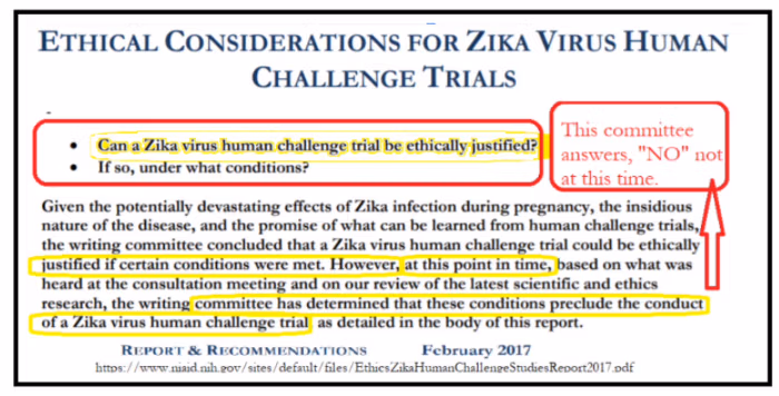 Etické zúčtování přišlo počátkem roku 2017, kdy NIAID a Walter Reed Army Institute of Research (WRAIR) svolaly panel k posouzení proveditelnosti testů na lidské zdraví.—záměrné infikování zdravých dobrovolníků virem Zika, aby se urychlil vývoj vakcíny. Výsledek panelu byl jasný: takové studie nebyly ospravedlnitelné vzhledem k potenciálu vážného poškození plodu a nejistotě dlouhodobých účinků.