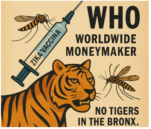 Společnosti jako Moderna, Takeda a Pfizer budou mít zisk, pokud WHO nebo CDC osvětlí vakcínu Zika zelenou a vytvoří „věčný produkt“, který přetrvá bez ohledu na potřebu. Jakmile budou schváleni, budou tvrdit vítězství nad hrozbou, která se nikdy plně nenaplnila – nebo, jak vtipkoval můj otec, právník z Bronxu, "Jsem oficiální chytač tygrů pro Bronx." [Žádní tygři?] … Podívejte se, jakou dobrou práci dělám! "